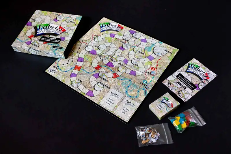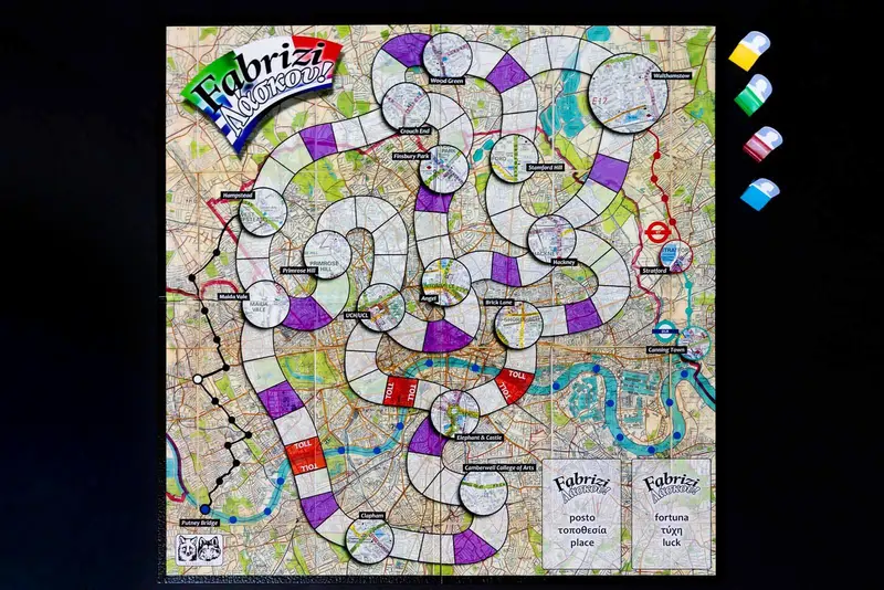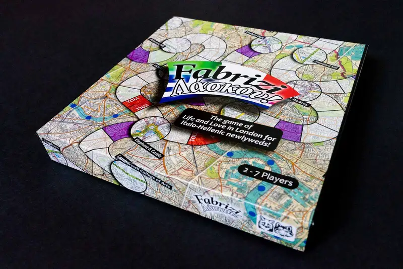 I came up with the concept of a dash all over London visiting places near and dear to them: where they met, their workplaces, their homes and the homes of their friends. I play-tested rigorously, tweaking the rules to balance the gameplay and maximise the fun. Then I meticulously designed the board, pieces, cards, rule booklet and boxes, including English, Italian and Greek text.