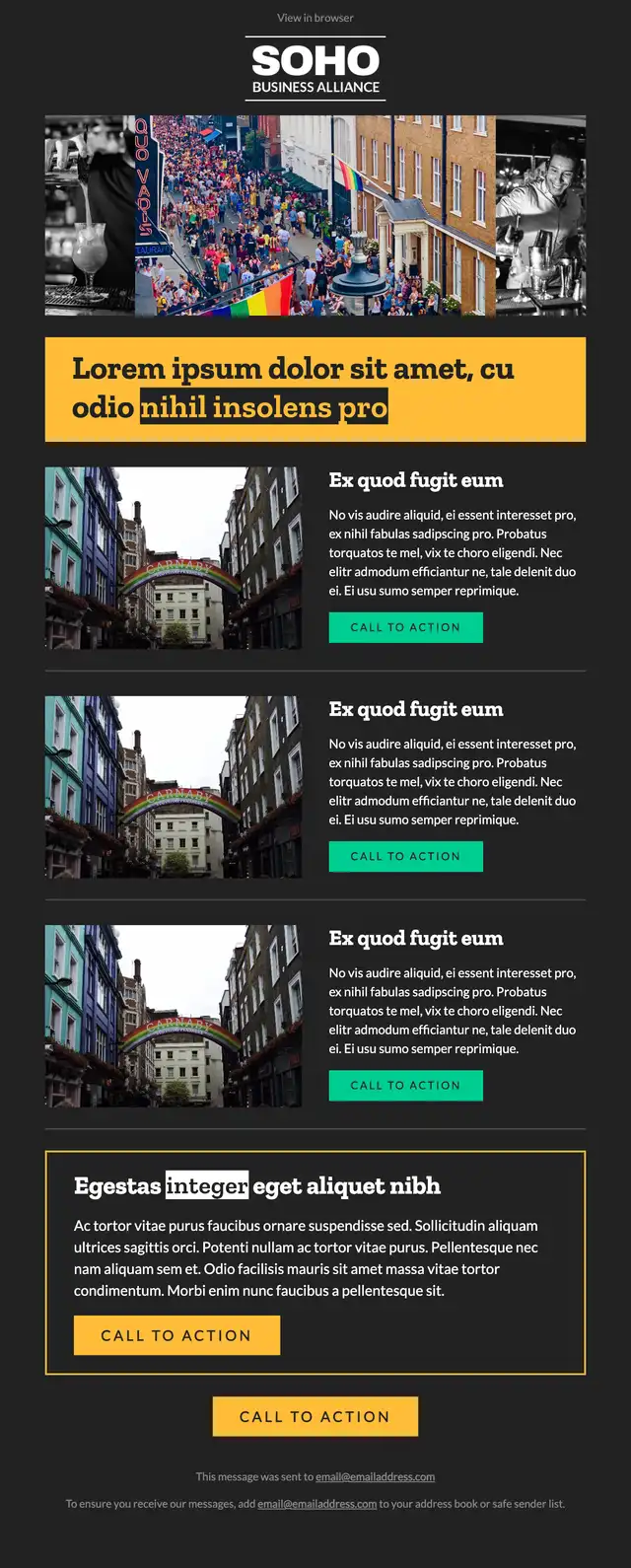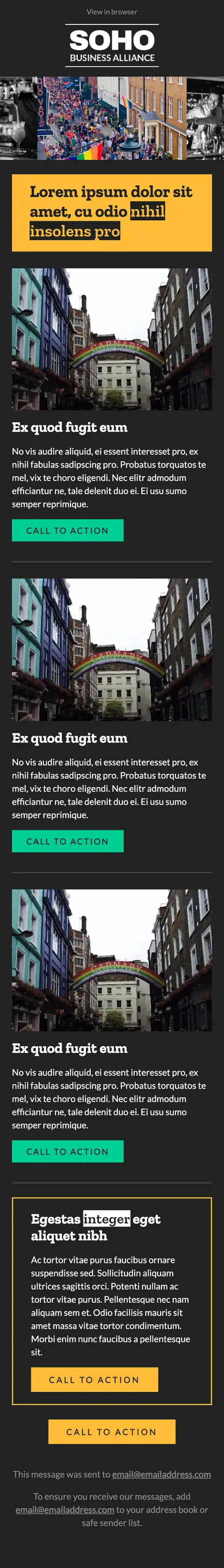 I was tasked with creating an email template for SBA's regular newsletter. They wanted the email to be in line with their brand guidelines, with a clean layout into which they could easily input images and text. I designed the layout, and coded the HTML for the template itself, incorporating responsive design so that the layout would adapt automatically to the screen size for the best viewing experience on all devices.